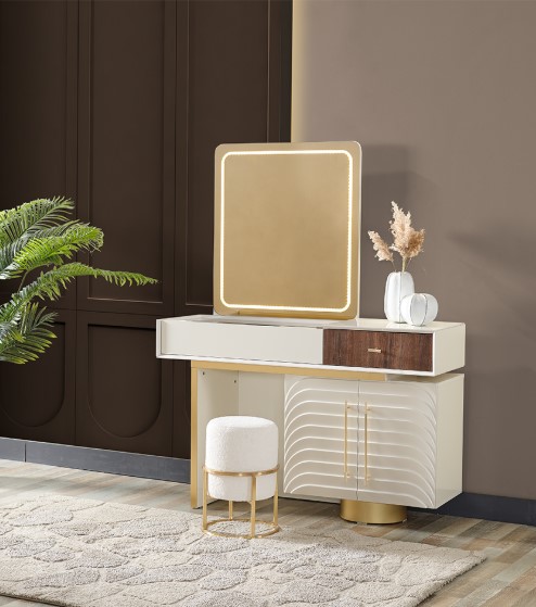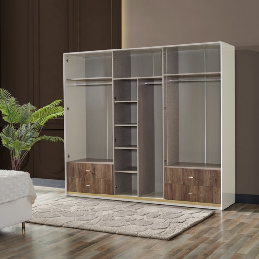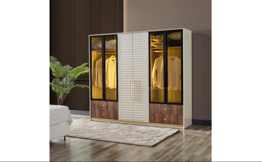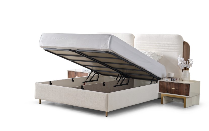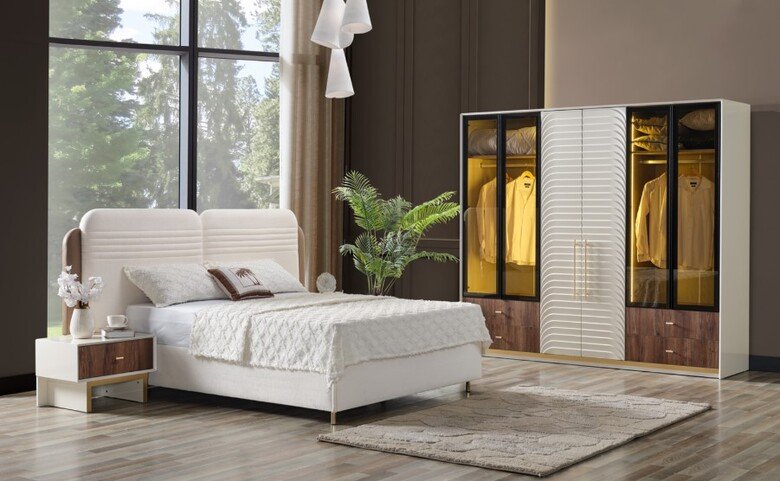 Doğal ahşap dokuları, modern tasarım detayları ve sıcak aydınlatma efektleriyle bu yatak odası takımı, huzurlu bir yaşam alanı sunuyor. Konforlu başlık tasarımı, minimalist komodin ve geniş depolama alanına sahip şık gardırobu, hem estetik hem de fonksiyonel bir çözüm sağlıyor. Günün yorgunluğunu atmak için tasarlanan bu özel takım, sizi rahatlıkla buluştururken evinize sofistike bir atmosfer kazandırıyor