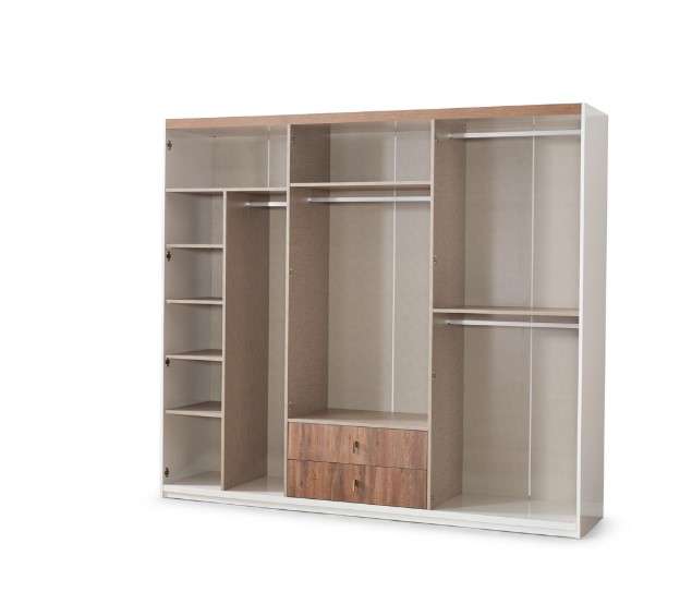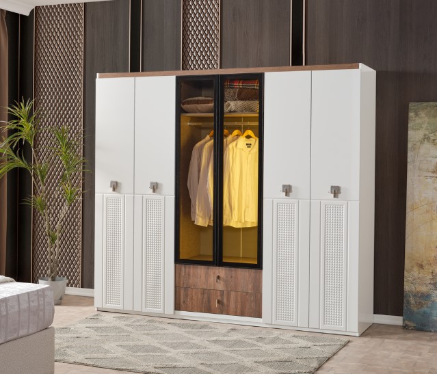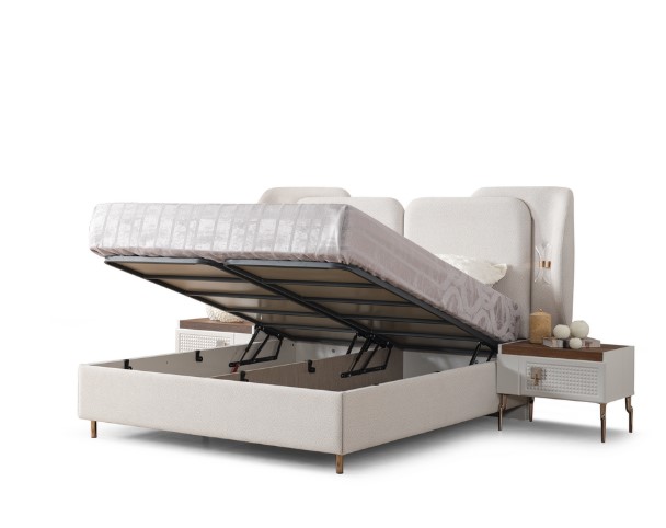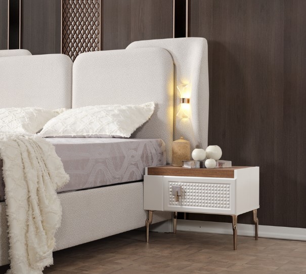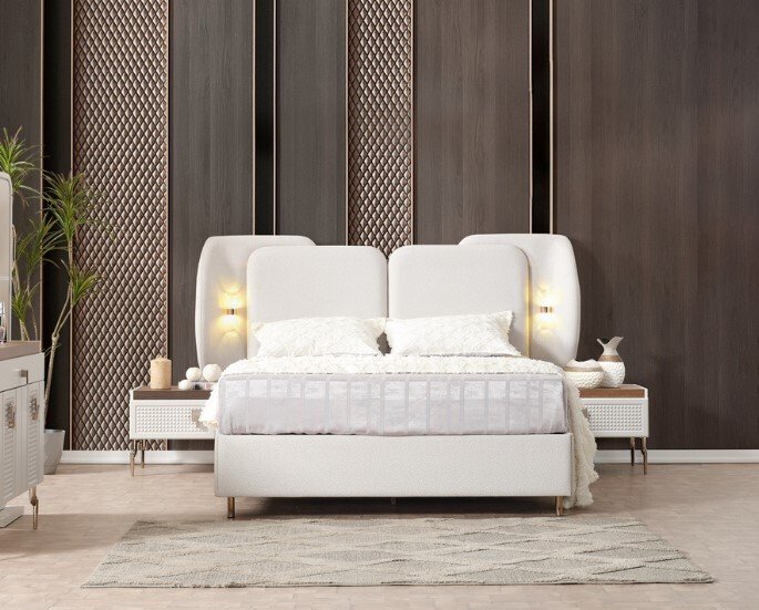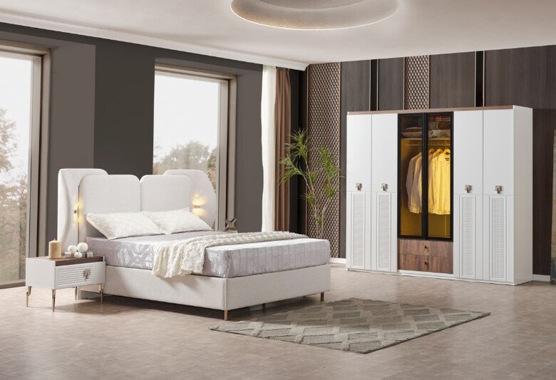 Yumuşak dokulu başlık tasarımı, geniş depolama alanına sahip gardırop ve fonksiyonel komodinleriyle hem düzeni hem de şıklığı bir araya getiriyor.