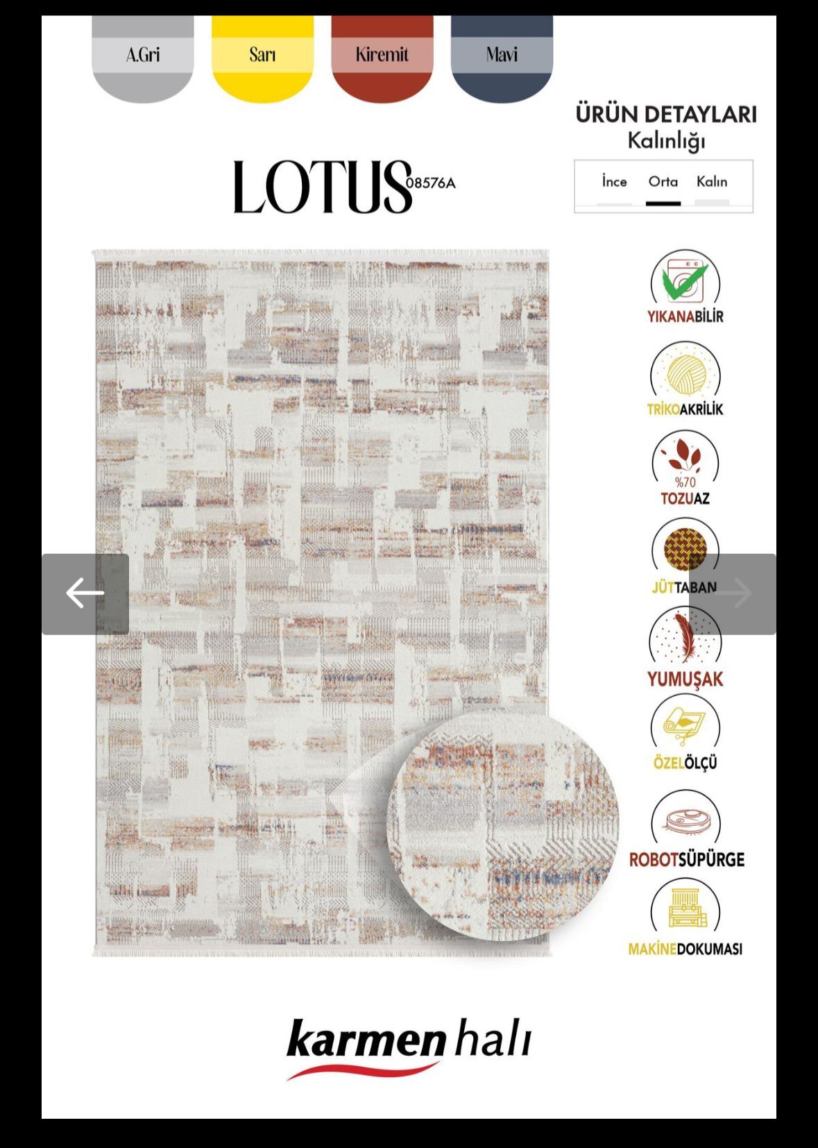 Bu sayede yıllar boyunca ilk günkü güzelliğini koruyacak. - Lotus Desenli Tasarım: Evinize sofistike bir dokunuş katar.
