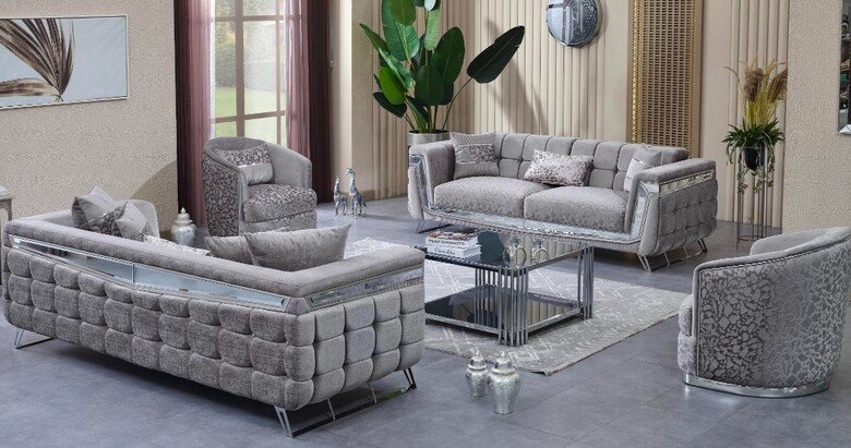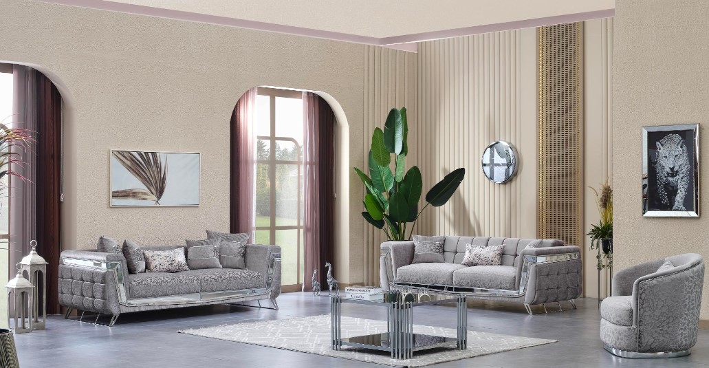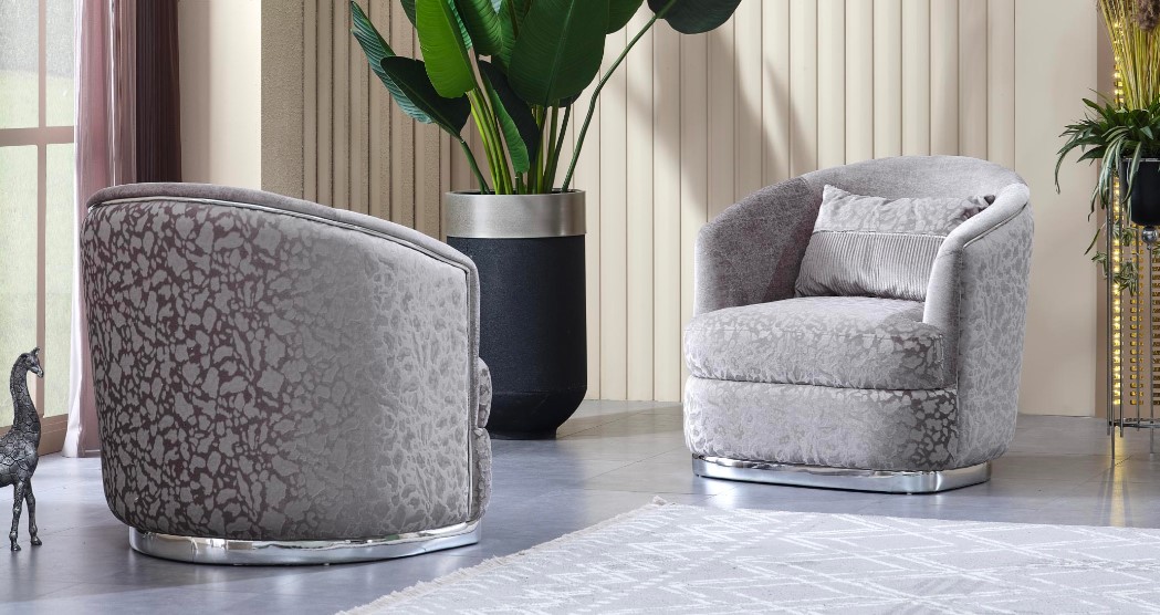 Milano Koltuk Takımı, yuvarlak hatlarıyla minimalizme vurgu yaparken, ışıltılı ve dokulu kumaşıyla gösterişi simgeliyor.